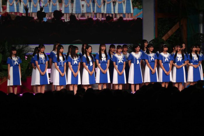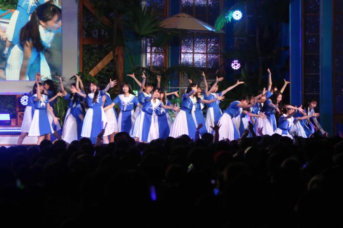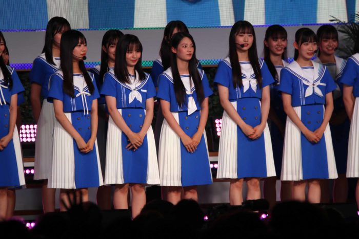 8月30日にリリースされるデビュー曲「青空について考える」が爽やかな青と白を基調とした衣装で披露された。