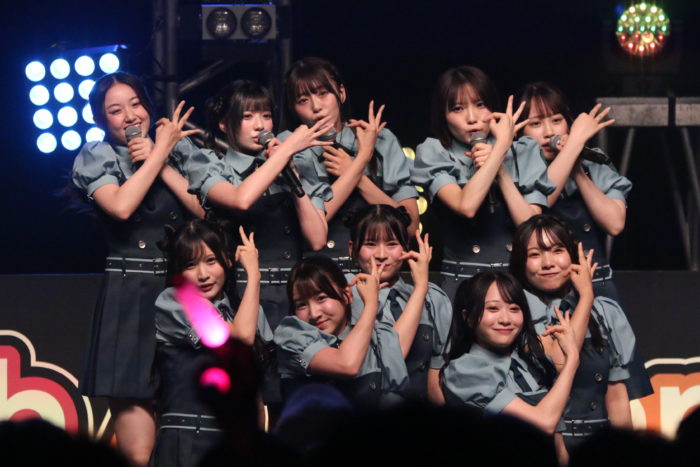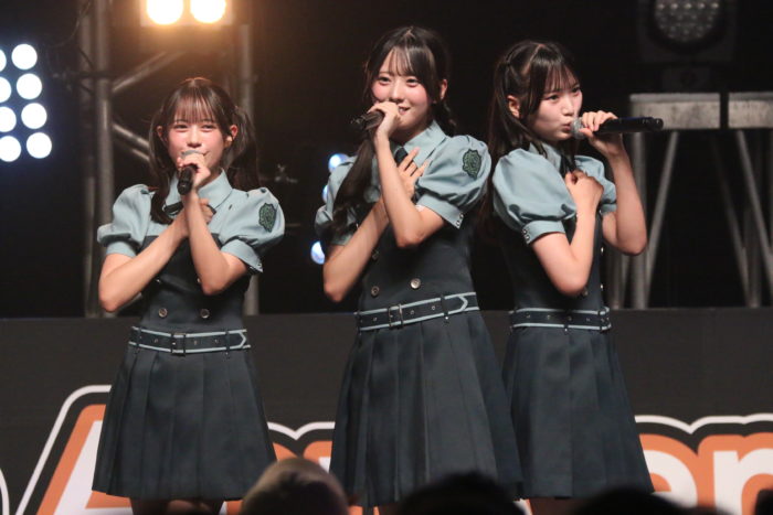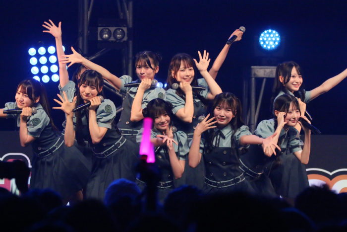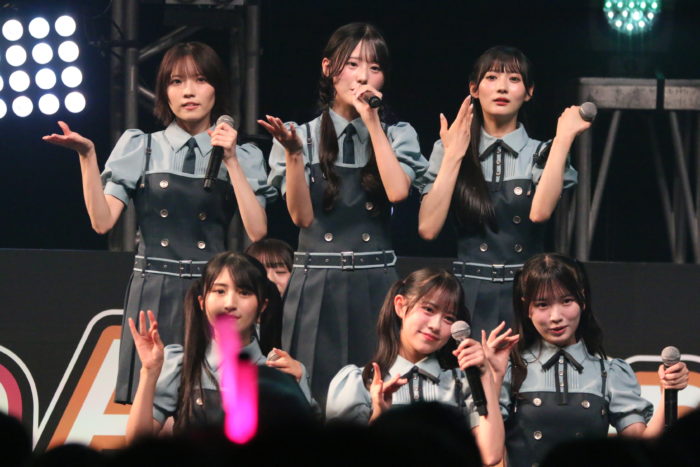 15名でのパフォーマンスは圧巻。トップバッターとして披露されたのは、遠藤莉乃&水野乃愛のWセンターの「恋愛変格活用」。イントロが流れた瞬間、観客のテンションが最高潮に達した。恋愛の”文法”をテーマにしたユニークな歌詞と、遠藤莉乃&水野乃愛のWセンターがキラリと光る構成で、観客の心を一気につかむ。
