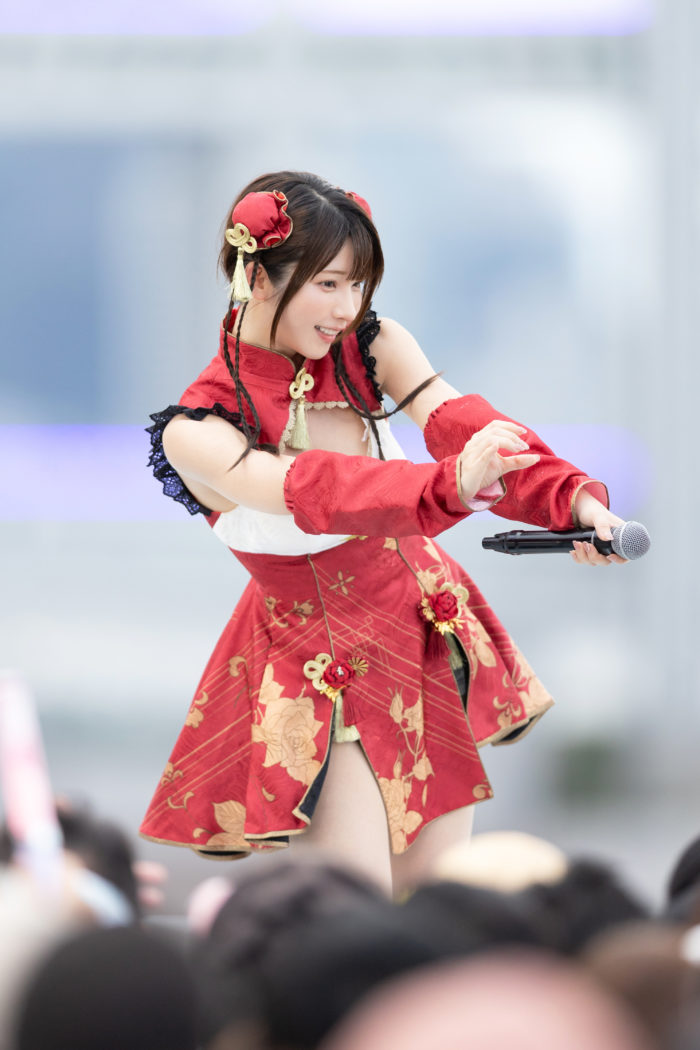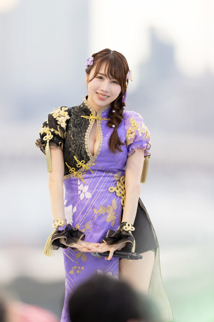 東雲うみも目を引いたメンバーのひとり。抜群のプロポーションと親しみやすい笑顔で、チャイナ衣装の魅力を最大限に引き出し、世界中の男性の心を鷲掴みに。軽やかなダンスとともに振りまかれるスマイルに、会場からは惜しみない歓声が上がった。