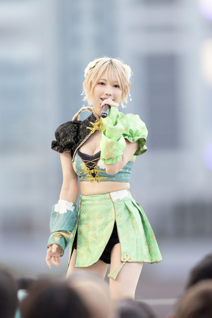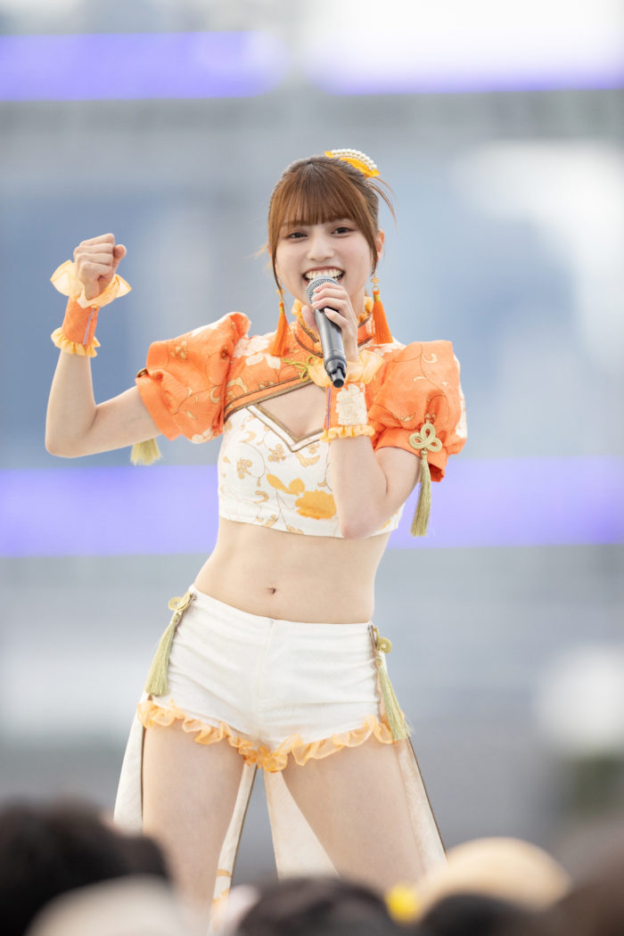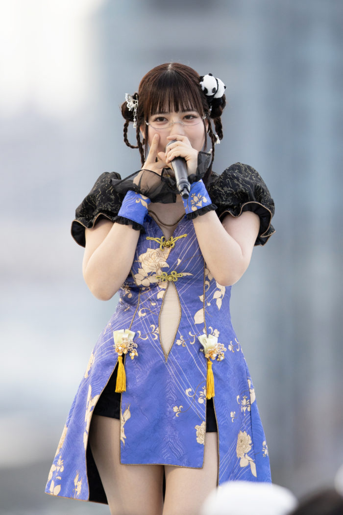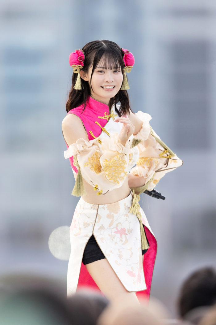 金髪ショートがトレードマークの篠崎こころもこの日のステージで圧倒的な存在感を放った。クールなビジュアルとチャイナドレスというギャップが際立ち、そのスタイリッシュなルックスに男女問わず視線が集中。シャープなダンスと、時折見せる笑顔が絶妙に交差し、さすがは“ビジュアル番長”と称される理由を体現するような見事なパフォーマンスを披露した。