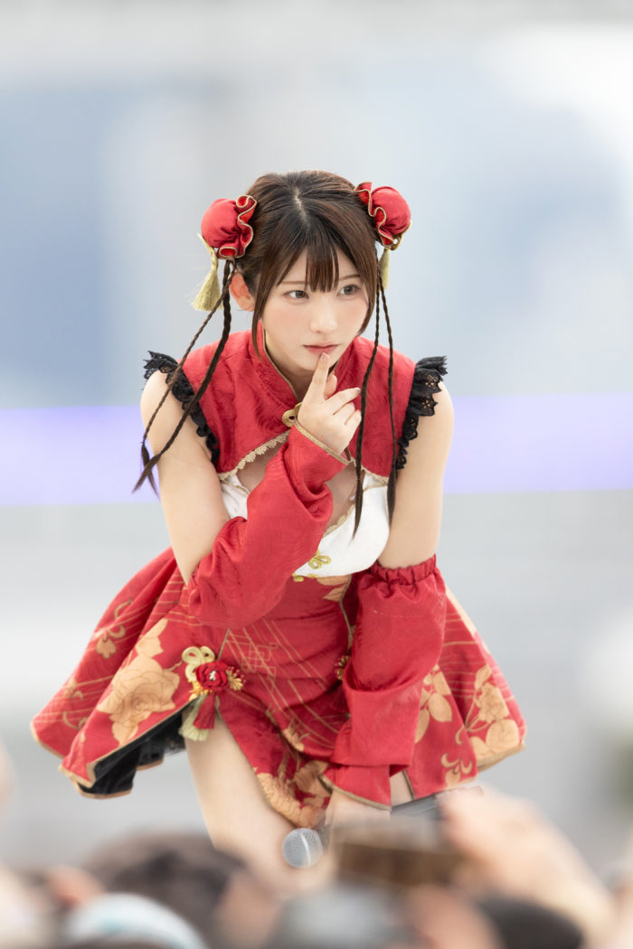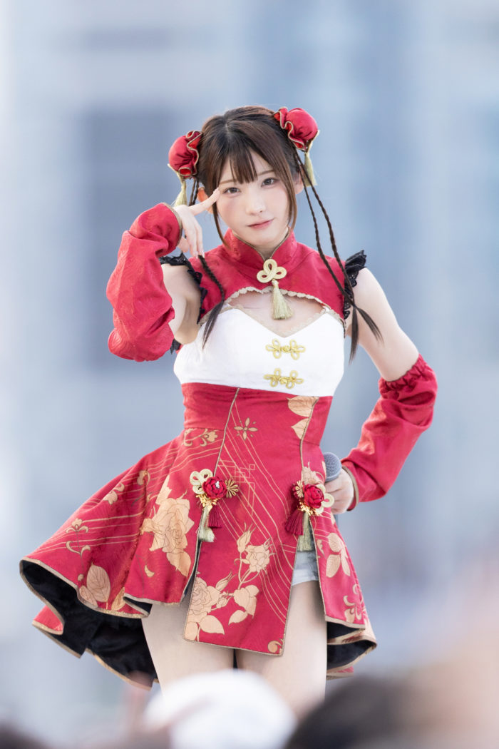 圧倒的な存在感を放ったのは、“絶対的センター”のえなこ。真っ赤なチャイナドレス姿で堂々とステージ中央に立ち、そのビジュアルはまさに“国宝級”。お団子ヘアとキラキラとした笑顔が相まって、SNSでは早くも「#えなこ」がトレンド入り。ステージに立つだけで空気を変えるそのオーラに、観客の誰しもが息を呑む。
