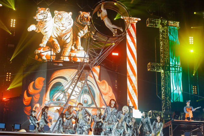 12thシングルBACKSメンバーが激しく舞うダンストラックから、石森璃花の「見てて」を合図に「港区パセリ」に突入すると、会場のボルテージは再び急上昇。ここからライブは後半戦に突入し、ピエロが登場したのを合図にメインステージは巨大なサーカス会場へと一変する。