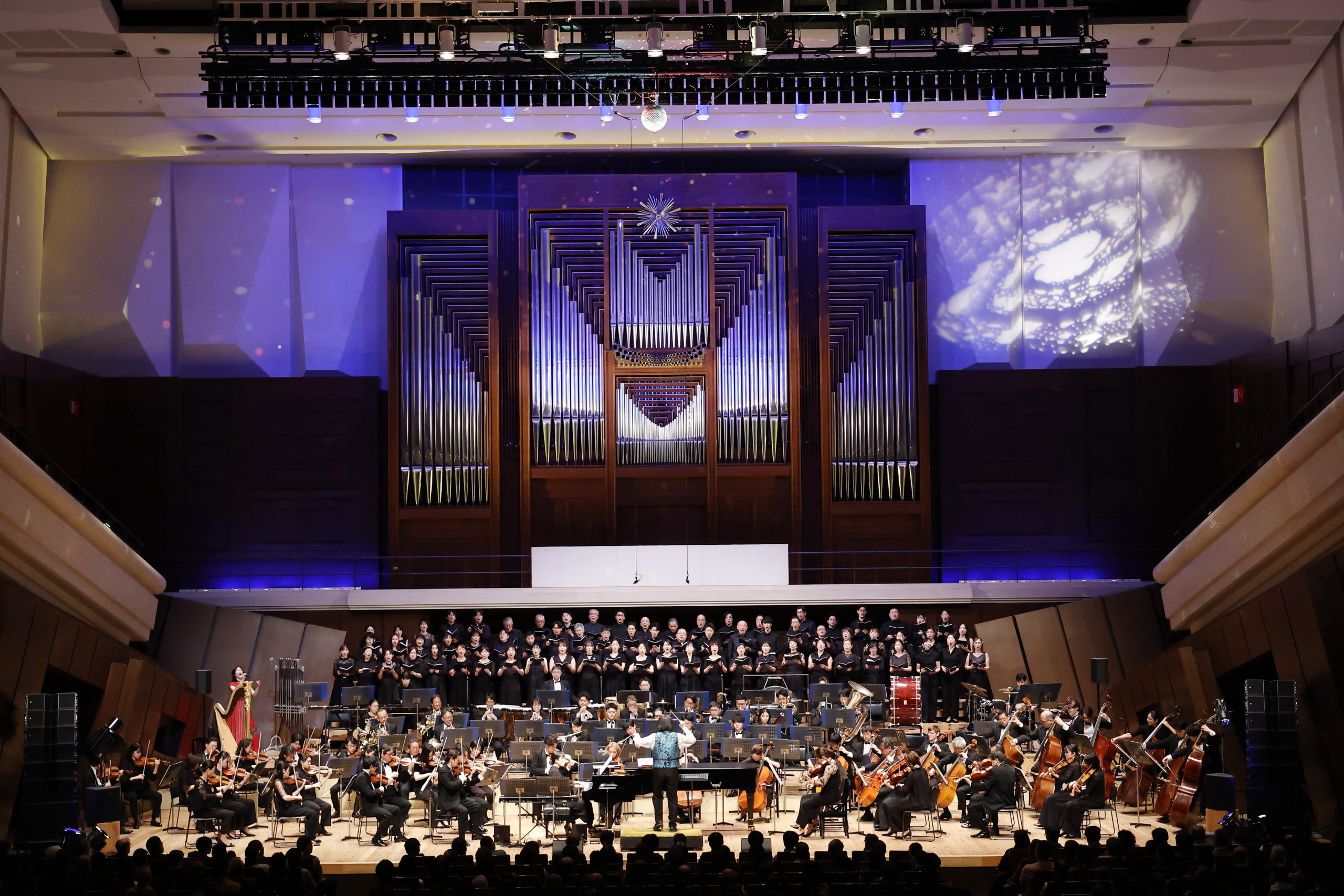 後半の「日本のうた」秋冬&新春メドレーでは、「赤とんぼ」「村祭り」「たきび」「冬景色」「スキー」「早春賦」「ふるさと」といった唱歌が次々に現れ、会場は一転してノスタルジックな空気に包まれる。とりわけ終曲の「ふるさと」では、言葉一つひとつを慈しむような名歌唱が胸を打った。過度な感情表現に頼らない栗友会合唱団のまっすぐな合唱が旋律の美しさを際立たせ、オーケストラの柔らかな響きと相まって、聴く者それぞれの記憶の原風景を静かに呼び覚ましていく。会場全体が同じ時間と場所を共有するかのような、深い余韻を残す名場面となった。
