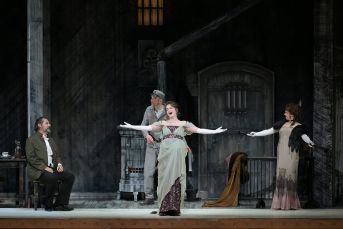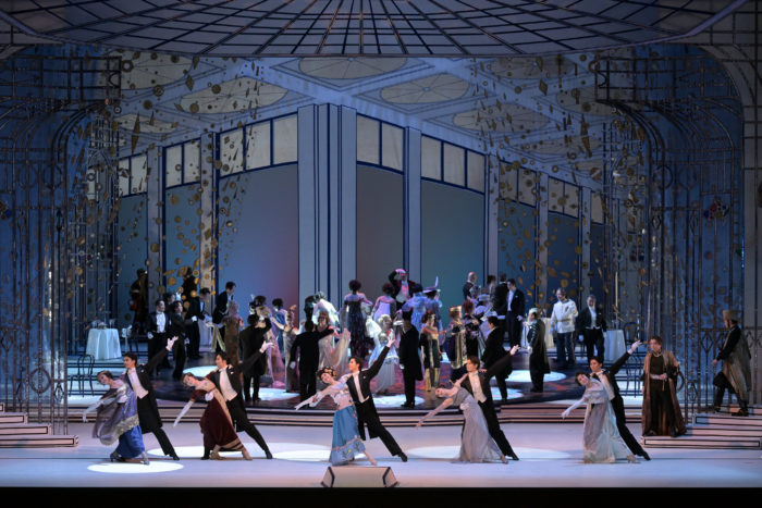 ユーゲント・シュティール調で統一された舞台美術と衣裳は、植物文様や流麗な曲線、金色を基調とした色彩が美しく、まるでクリムトの絵画世界に足を踏み入れたかのよう。幕切れで刑務所から舞踏会場へ一瞬で転換する場面の鮮やかさも印象深い。