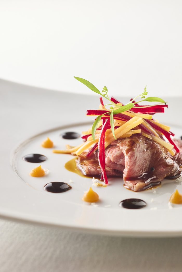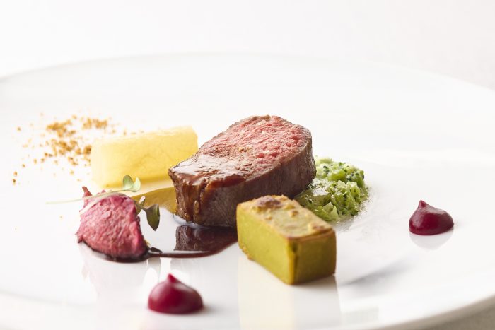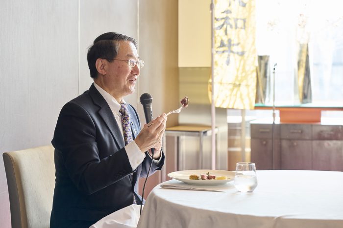 「サンス・エ・サヴール」料理長 鈴木孝徳氏は、鳥取県の生産者を訪れ厳選した食材で、この日のために特別に”鳥取和牛尽くし”のフルコースを創り上げました。鈴木シェフが創り上げた”鳥取和牛尽くし”のフルコースは火入れの技量が卓越。濃厚なフランス料理とは一線を画す、酸味・甘み・香りを生かした繊細で軽やかな味わいに魅了されました。