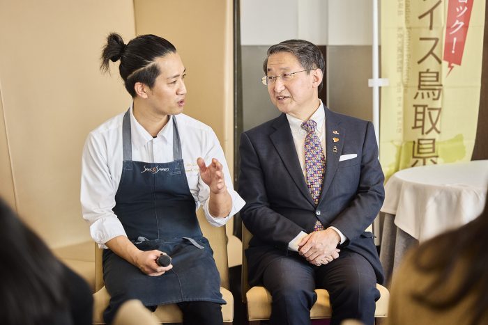 「サンス・エ・サヴール」料理長 鈴木孝徳氏(左)と鳥取県知事 平井伸治氏(右)