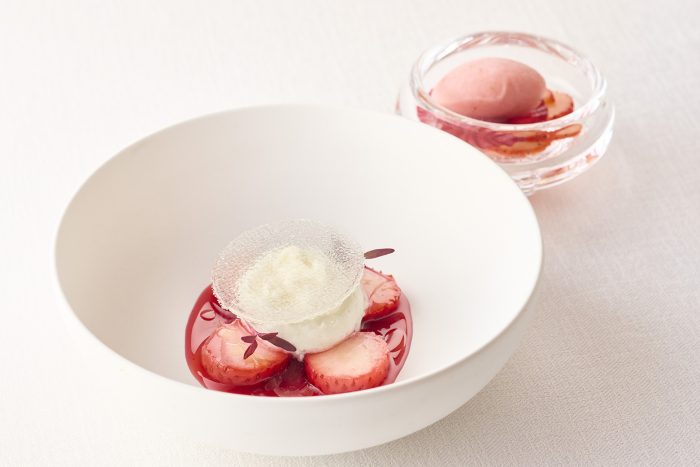 「サンス・エ・サヴール」料理長 鈴木孝徳氏は、鳥取県の生産者を訪れ厳選した食材で、この日のために特別に”鳥取和牛尽くし”のフルコースを創り上げました。鈴木シェフが創り上げた”鳥取和牛尽くし”のフルコースは火入れの技量が卓越。濃厚なフランス料理とは一線を画す、酸味・甘み・香りを生かした繊細で軽やかな味わいに魅了されました。