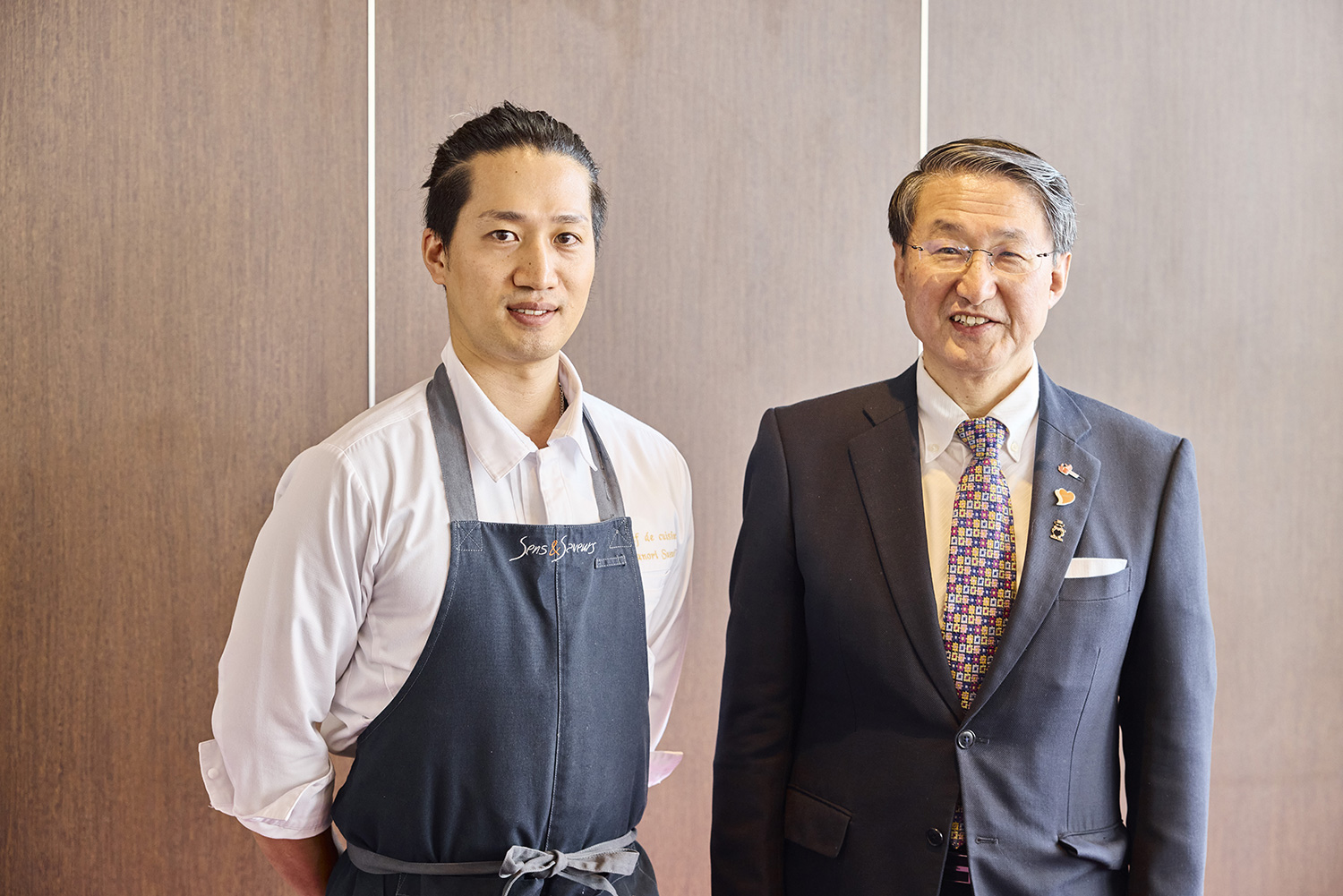 「サンス・エ・サヴール」料理長 鈴木孝徳氏(左)と鳥取県知事 平井伸治氏(右)