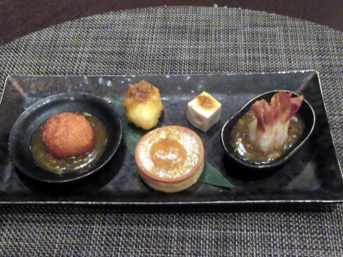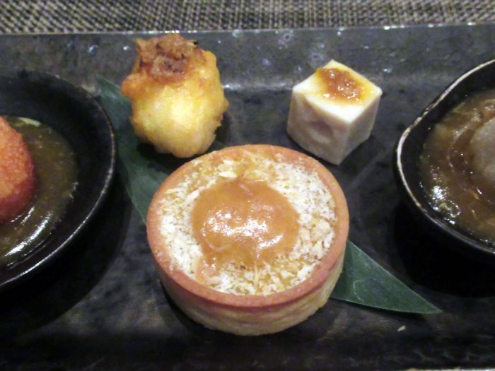 ・上海蟹入りミルク揚げ、上海蟹ライスコロッケ、ごま豆腐 上海蟹醬、上海蟹醬添え揚げワンタン、上海蟹味噌入りタルトグラタン