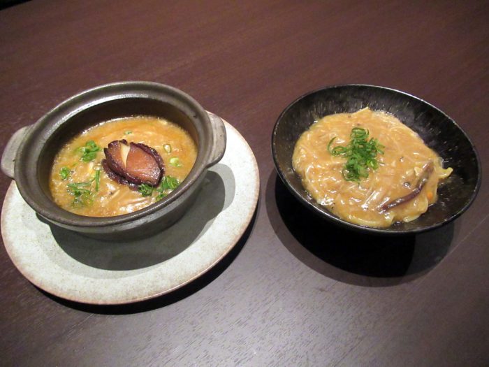 左から鮑と上海蟹味噌入りあんかけ焼きチャーハン、上海蟹味噌あんかけリングイネ
