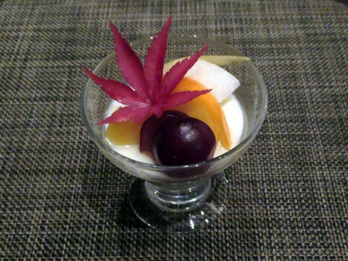 盛り付けには秋冬を象徴するもみじをあしらい、栗と合わせることで季節感を凛と感じさせる一皿に。フルーツは マスカット・柿・梨 の三種をバランスよく配し、口に運ぶたびに瑞々しさと香りが移ろう、まるで“小さな果実の三重奏”のような構成です。