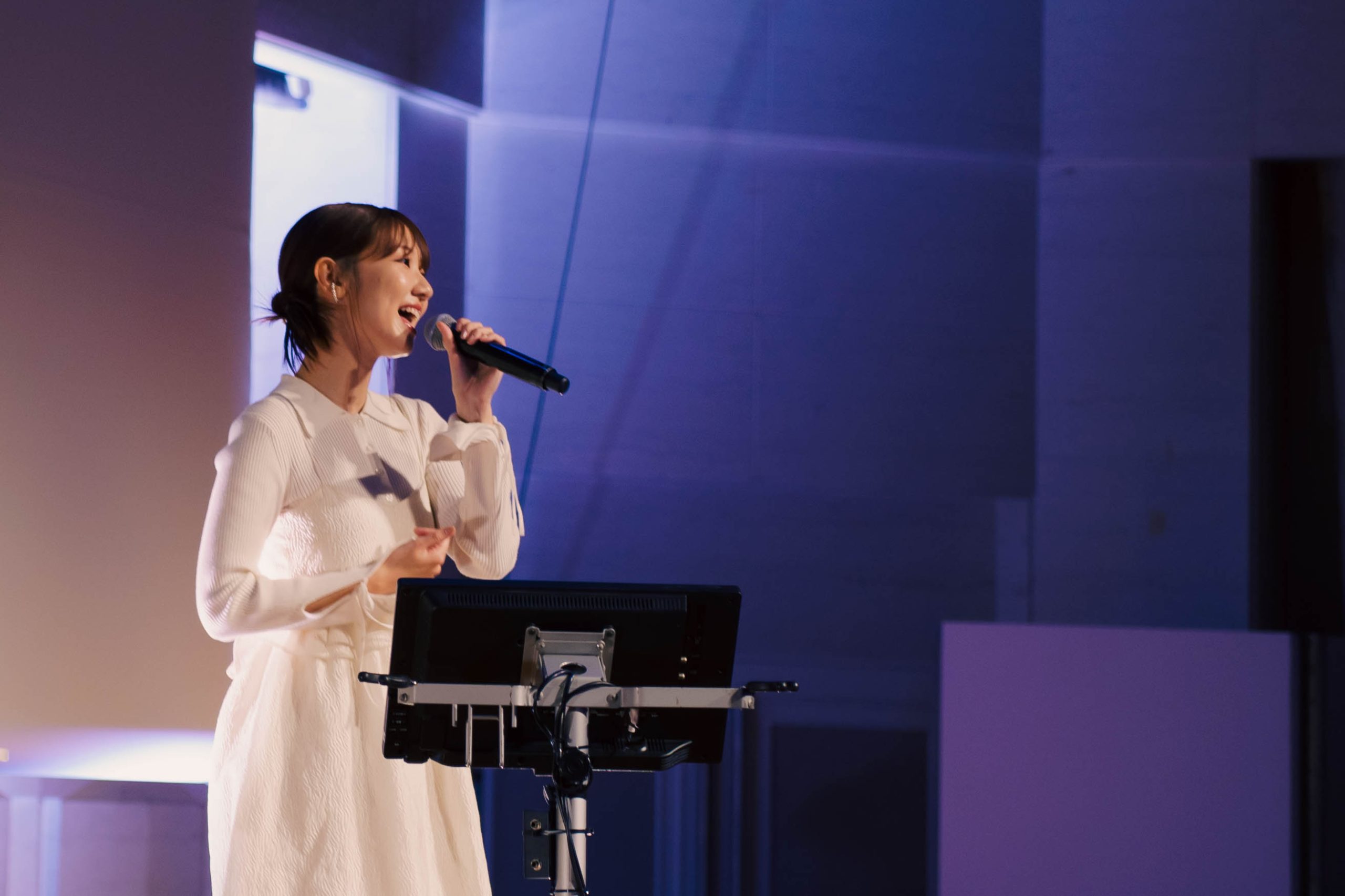 1曲目は懐かしい名曲のカバー。「歌ってそうだけど、実は歌ったことがなくて、最近習得しました」と前置きし、「今、すっごい保険をかけてるね」と照れ笑い。スイートな歌声に合わせて揺れるペンライトの光が、やさしく会場をつつみ込みます。2曲目は誰もが知るアイドルソングで、客席と息の合ったコール&レスポンスを披露。