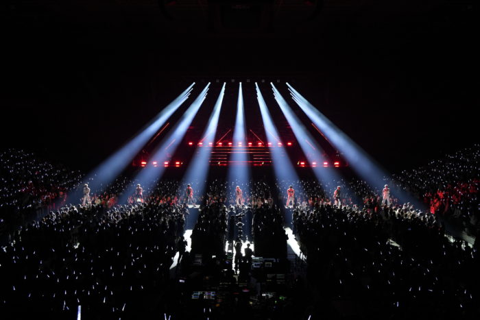 グループの状態が非常にいいことは囲み取材からも伝わってくる。そんな彼らのライブの幕が上がる。オープニング映像が終わると、バンドがステージで演奏をスタート。メンバー一人ひとりの名前、そしてシルエットもモニターに映し出される。いよいよメンバーが登場するかと思いつつ、実はステージに映し出されているのはダミー。本人たちは「Most Wanted」で客席に登場し、オーディエンスを驚かせる。松井の「できたばかりのこの会場に、俺らが伝説を作りに来ました!」で、「Get Wild」へ。客席を歩きながらステージに戻り、「HIGHER EX」へと繋がっていく。「CRASH」では、日髙竜太が「拳を上げて、全員の声を聴かせてください!」とオーディエンスたちに声を出させていく。その後も「Drop Dead feat. TRINTIY」、「We never die」、「テンハネ-1000%-」とアッパーな曲で一気にオープニングパートを駆け抜けていった。