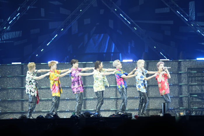 続いては、日替わり曲コーナー。1日目では「In My Eyes」、「HIGHWAY」を披露したが、2日目にあたる本公演では日髙、加納嘉将、深堀、砂田による「good day good night」、海沼流星、奥田力也、松井による「マーメイド」が披露された。そして、「まだまだ最高のステージを用意しているので、最高の思い出を更新していきましょう」という松井の言葉で「360°」へ。メンバー同士目を合わせたり、じゃれ合ったり、楽しそうに7人揃ってパフォーマンスをしていった。