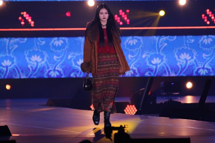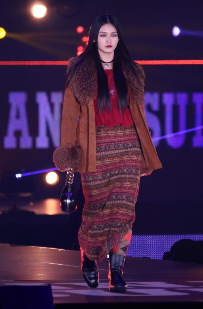 山崎はブラウンやレッドを基調とした秋冬ファッションで登場。