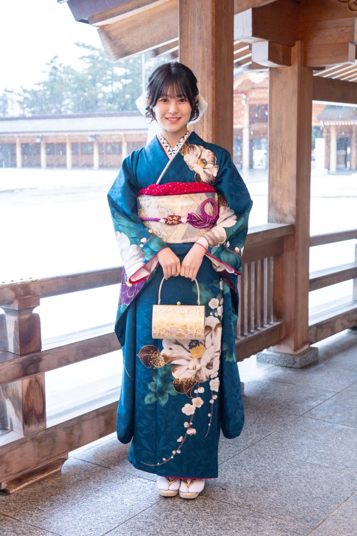 大きな花が印象的な青系の着物に、昨晩自分で作ったという白い大きなリボンを髪に飾った北村優羽。NGT48 のイメージカラーである赤の重ね衿には、動くたびにキラキラするラインストーンが並び、華やかさを増していた。
