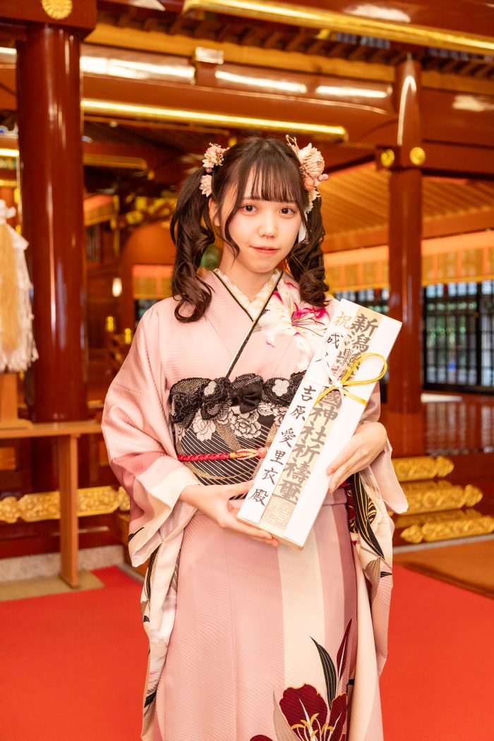 一方、メンバーカラーであるピンクの着物にヘアスタイルはツインテールにした吉原愛里衣は、帯・帯揚げ・重ね衿は少し大人っぽい黒のデザインを合わせた。