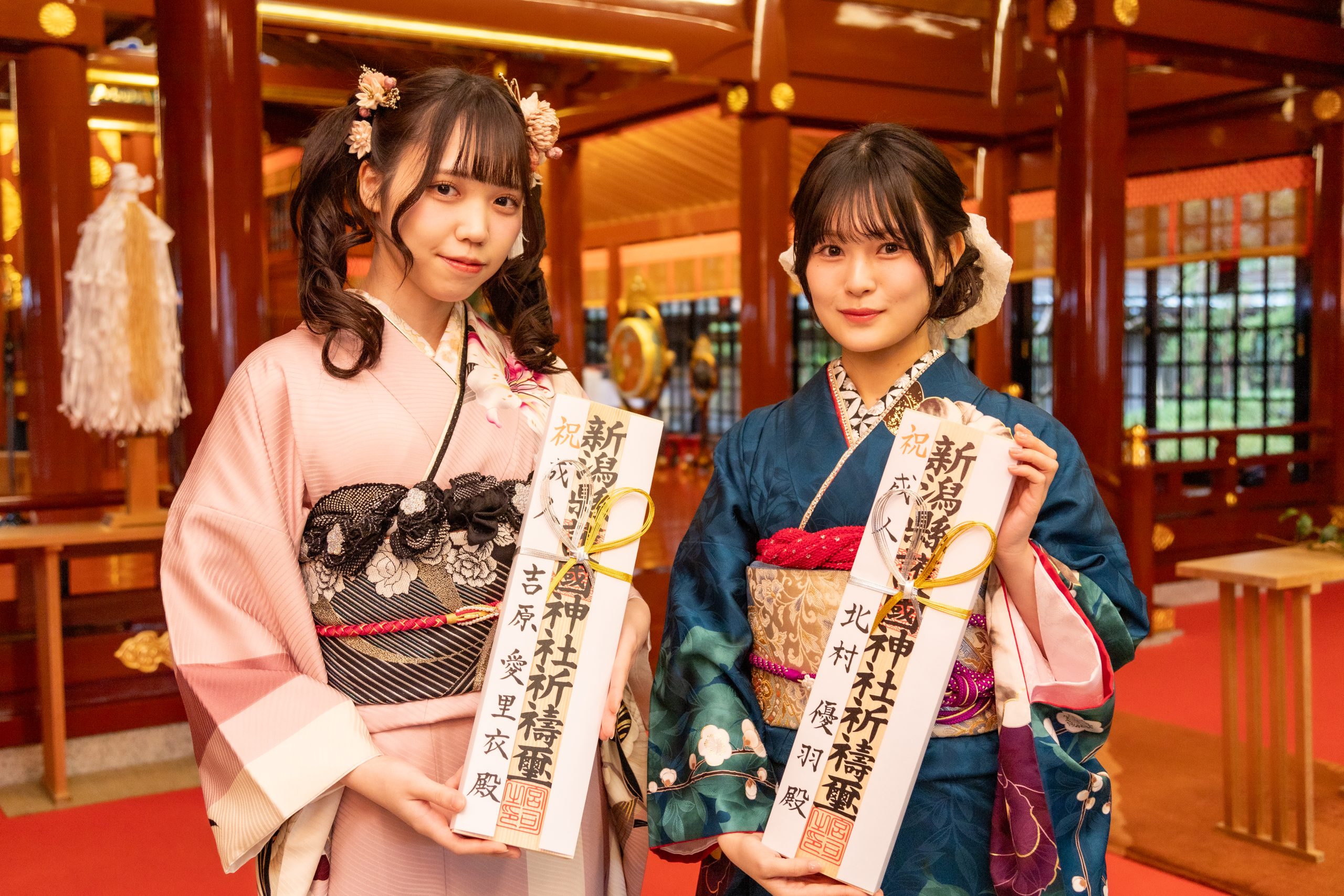 この日のために「ジョイフル恵利イオン新潟青山店」で振袖選びをした北村優羽と吉原愛里衣。
