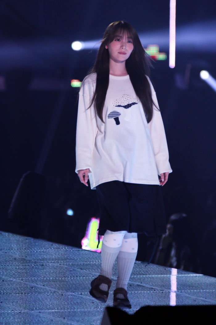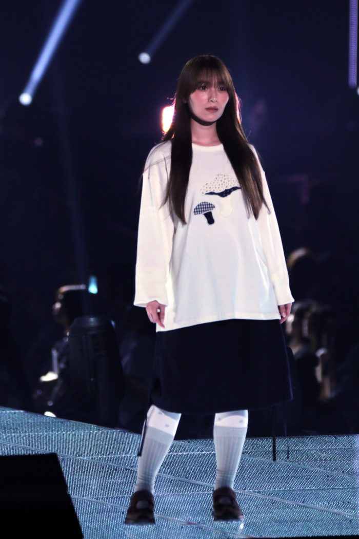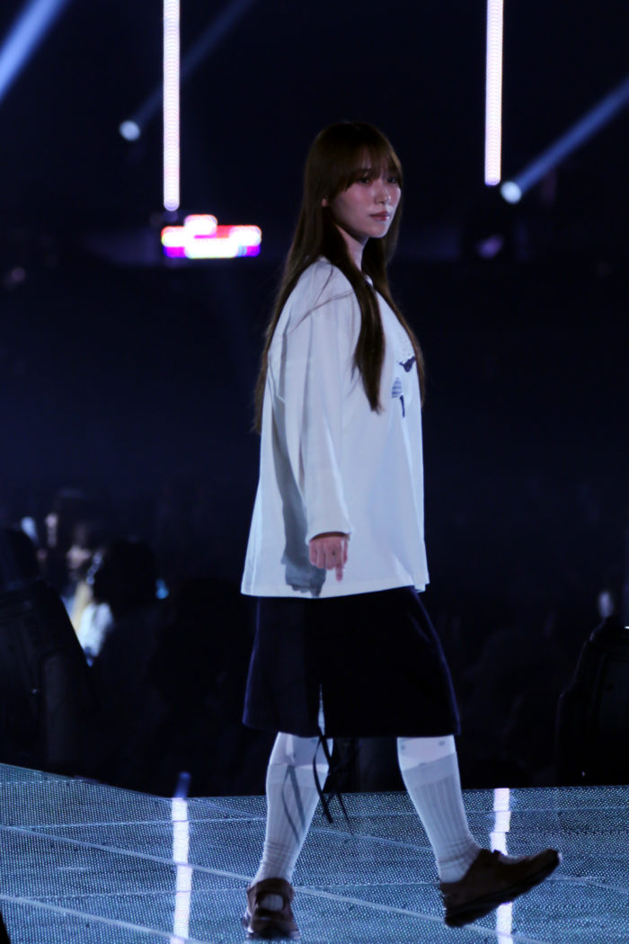 白のスウェットに黒の膝丈スカートを合わせたシンプルながらも計算されたスタイリング。全体的にオーバーサイズのシルエットでリラックス感を出しつつ、白タイツを組み合わせることで一気にスタイリッシュな雰囲気へと昇華。守屋ならではのバランス感覚が光るコーディネートとなった。