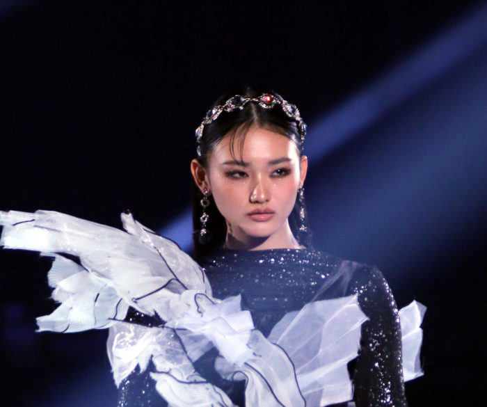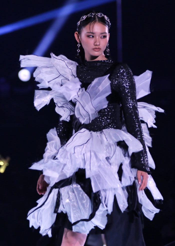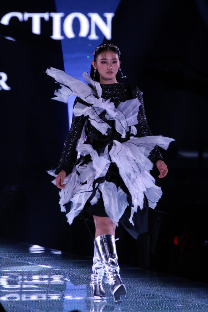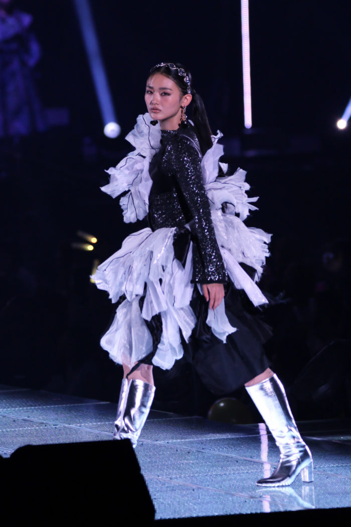 3回目のステージは「Archi Dan Te.」。山崎が纏ったのは、エッジの効いた個性派ドレスにシルバーのロングブーツを合わせた近未来的な装い。直線的で構築的なシルエットに、メタリックな質感が加わり、“未来”の空気を運び込んだ。