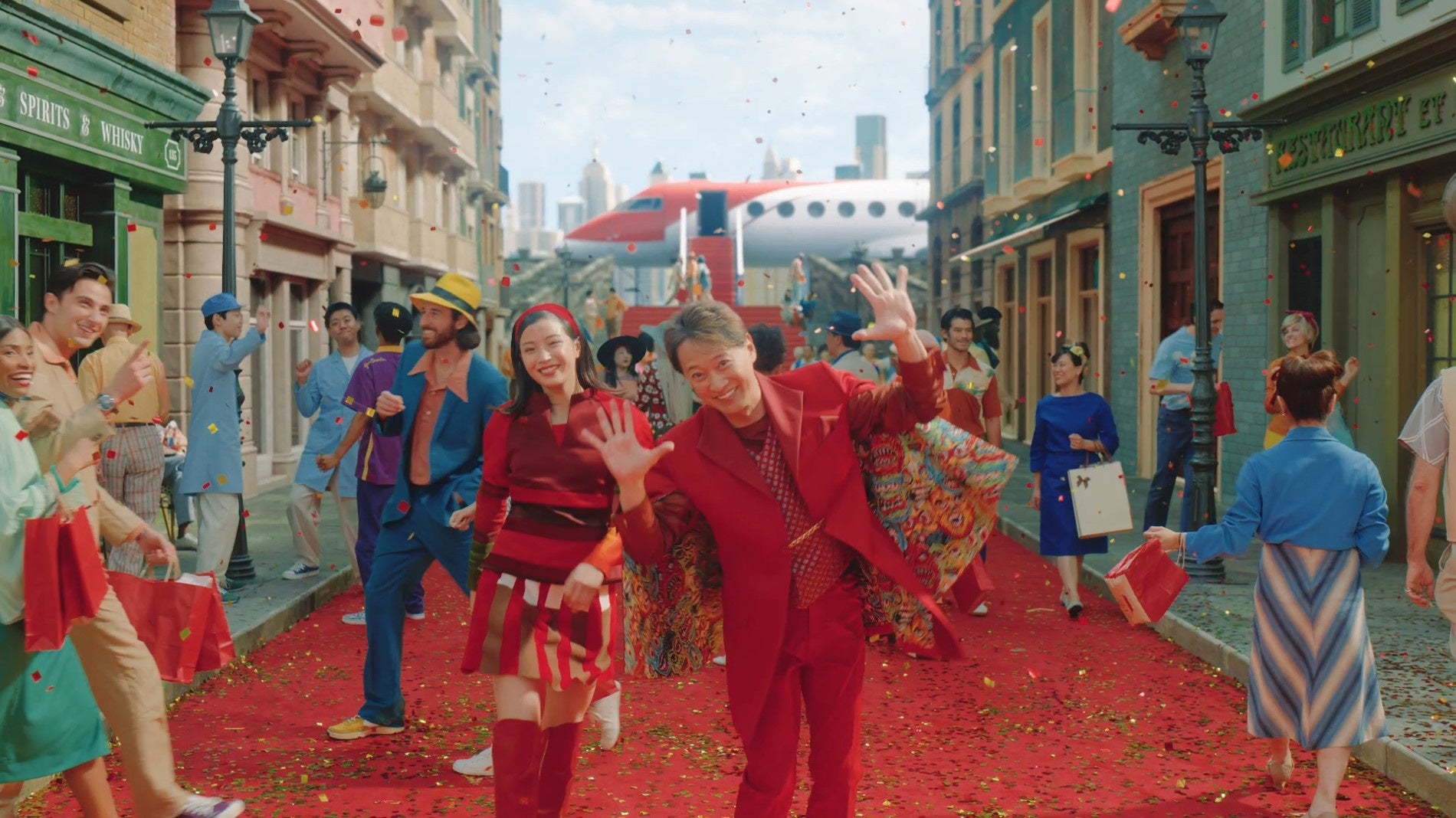 多くの買い物客で賑わう街の通りに真っ赤なじゅうたんが敷かれ、キラキラと紙吹雪が舞う中、買い物を楽しくする人物“ペイトク”(中居さん)が登場します。軽やかなステップを踏みながら歩く“ペイトク”がパチンと指を鳴らすと、魔法の力でインコが人間の姿の“ペイスズ”(広瀬さん)に変身。2人はさらに踊りながら街を歩き、買い物中の人々に「チチンペイペイソフトバンク!」と魔法をかけ、次々と買い物をおトクにしていきます。気づけば街じゅうがおトクな買い物客であふれ、ハッピーな笑顔で大盛り上がり。ショッピングカートを押している人まで巻き込んで、全員でダンスを楽しみます。そんな様子を窓辺で眺めていたオウムも魔法の力で人間の姿の“ペイハナ”に変身しダンスに合流。ペイしてトクする料金プラン「ペイトク」による、新時代の幕開けを祝います。