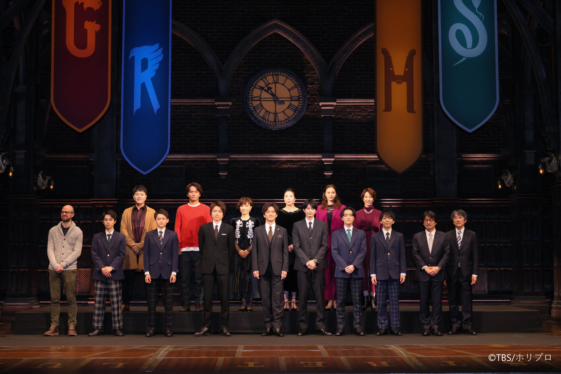 製作発表の司会を務めたのは、本舞台の応援大使の一人、日比麻音子TBSアナウンサー。ホグワーツ魔法魔術学校の4寮の1つ、スリザリンの緑色のマフラーとローブを着て登場した。まず冒頭、主催者の株式会社TBSテレビ代表取締役社長・佐々木卓と、株式会社ホリプロ代表取締役社長・堀義貴からの挨拶があり、公演にかける両社の意気込みが語られた。