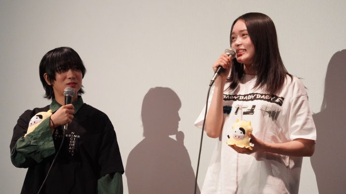 映画上映後、まず阪元監督が舞台に上がり集まったファンに感謝の言葉を伝えると、早速W主演の二人が登壇。伊澤がデザインしたTシャツに身を包み登壇した髙石は「本日はこの3人でシネマ・ロサに帰ってくることができて本当に嬉しいです」と話すと、伊澤も「今日は短い時間ですけどよろしくお願いします。」と挨拶。