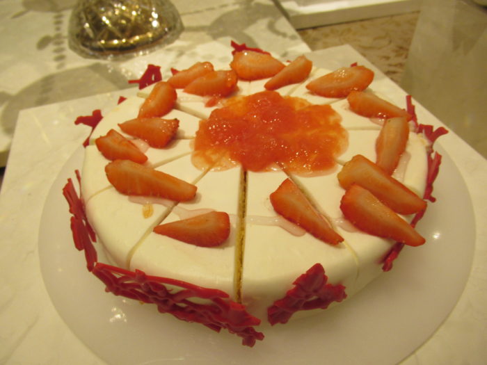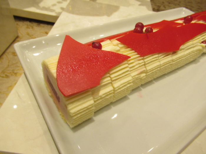 苺のレアチーズムースでゼリーを包み、まわりをカラマンシークリームで仕上げた一品。爽やかな酸味が楽しめる華やかなブッシュ・ド・ノエル風スイーツです。