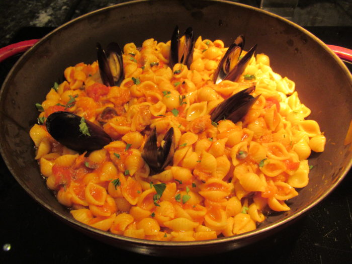 ・ムール貝とあさりのコンキリエ 味噌トマトと山椒オイルの香り