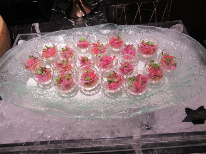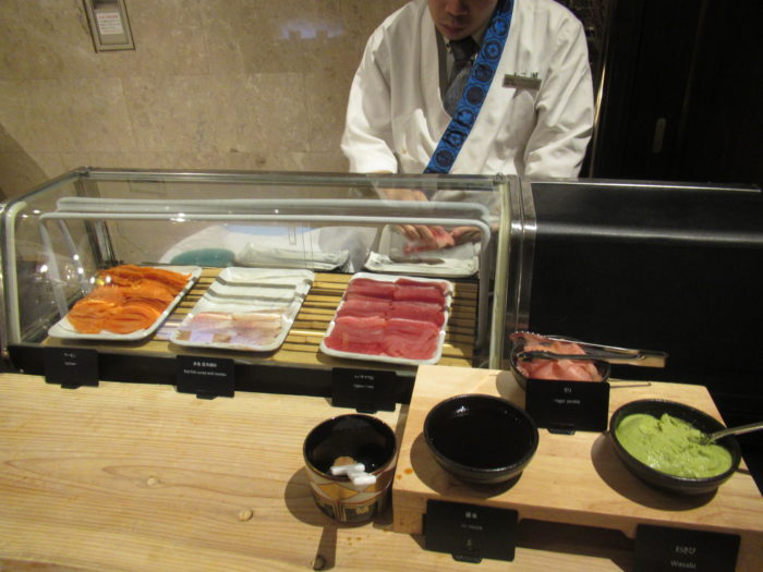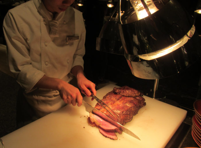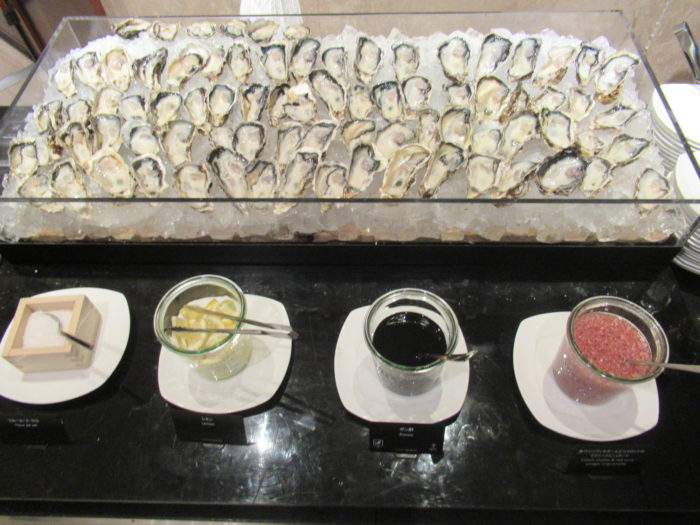 マーブルラウンジ冬のディナービュッフェは、日替わり三種の新鮮なネタを使用した握り寿司、3種のお味で賞味できる生牡蠣、牛肉の旨みを存分に楽しめるマーブルラウンジ名物のローストビーフの他、「味噌風味のメープルシロップでマリネしたローストダック」、「ブルゴーニュ風牛肉の煮込み」などの肉料理が’揃っていました。