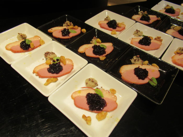 ・鴨胸肉の燻製 牛蒡のピュレとバルサミコジュレ 柚子の香りとカカオニブを添えて