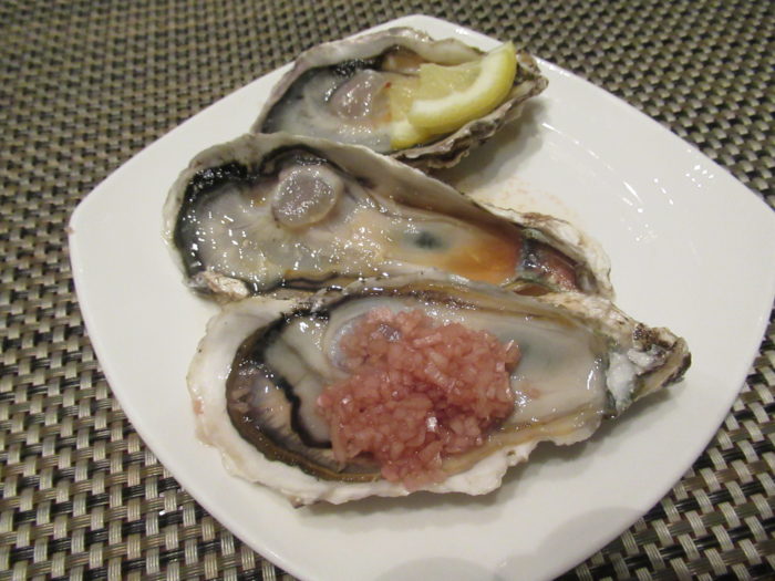 3種のお味でいただける生牡蠣は、一人様3個セットにて用意されていました。金貨と交換する方式が採用されていました。