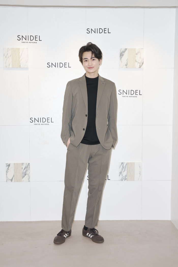 シックなジャケットスタイルで登場した西垣匠さん。SNIDELの世界観を体験し、「可愛らしいお洋服が並んでいて、新鮮でした!」と笑顔。この春の印象的な出会いについて「最近、いい炊飯器と出会いまして、お米を炊くのにはまっています。結構奮発して買いました。それを愛用しています!」と微笑ましいエピソードを披露していました。
